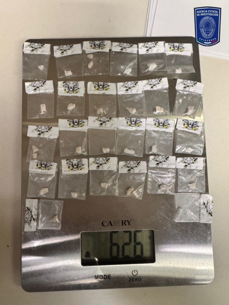 Elementos de la Agencia Estatal de Investigación, adscritos a la Fiscalía de Distrito Zona Occidente, detuvieron en céntricas calles de la ciudad de Cuauhtémoc a una persona de nombre Noel A. M., de 34 años de edad, en posesión de dosis de mariguana y cristal.