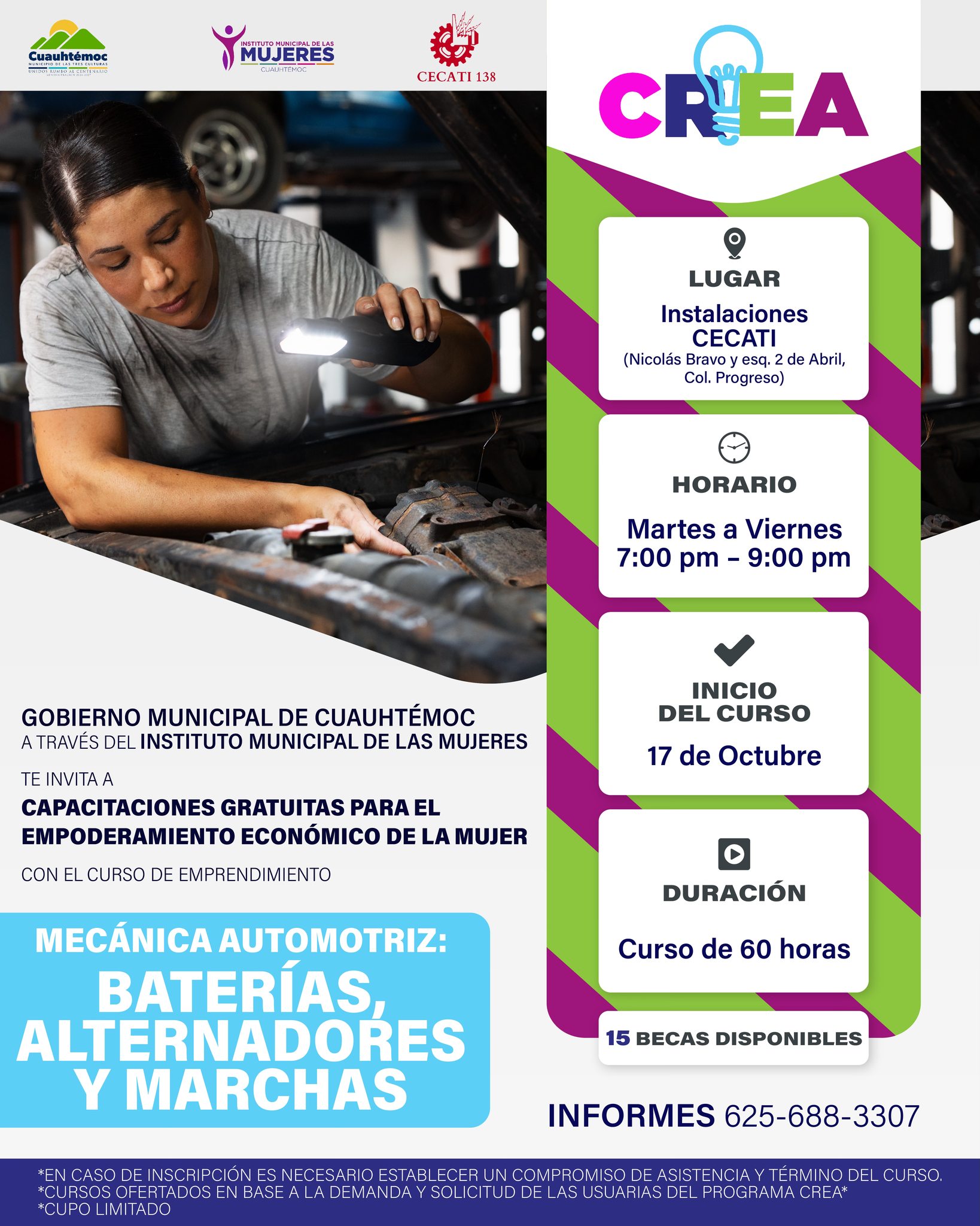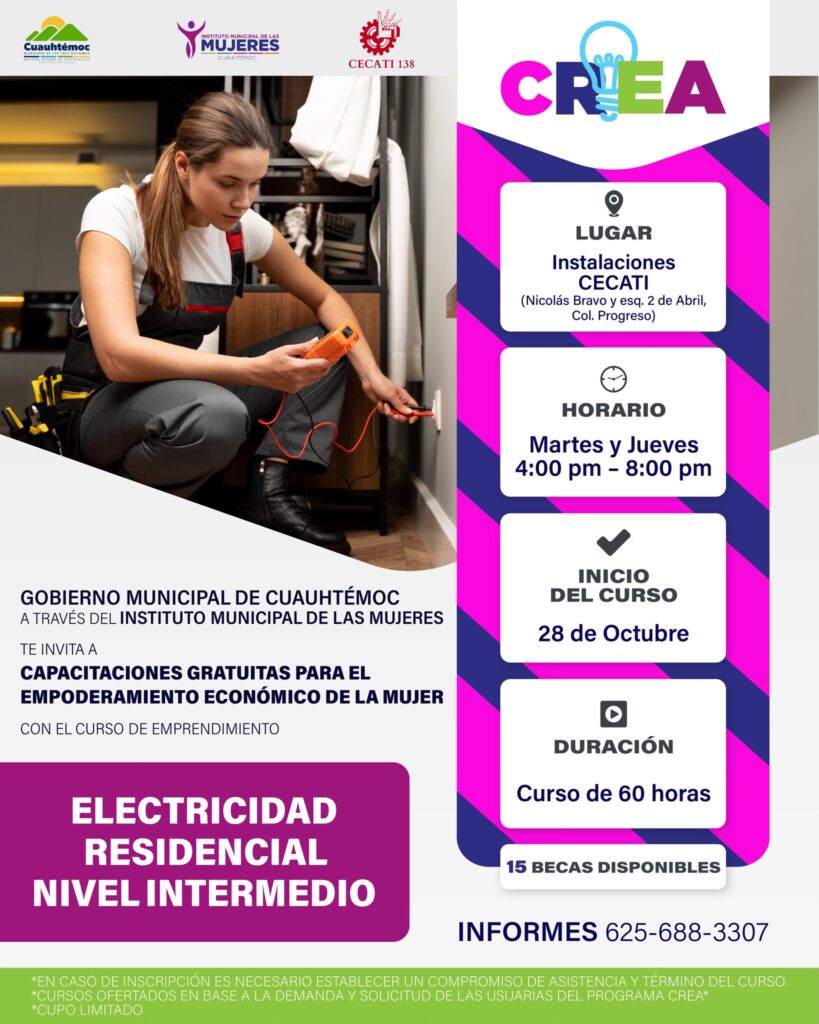 El Gobierno Municipal de Cuauhtémoc, a través del Instituto Municipal de las Mujeres y su Programa CREA, invita a mujeres a fortalecer sus habilidades y su independencia económica con los nuevos cursos impartidos por el CECATI 138:
