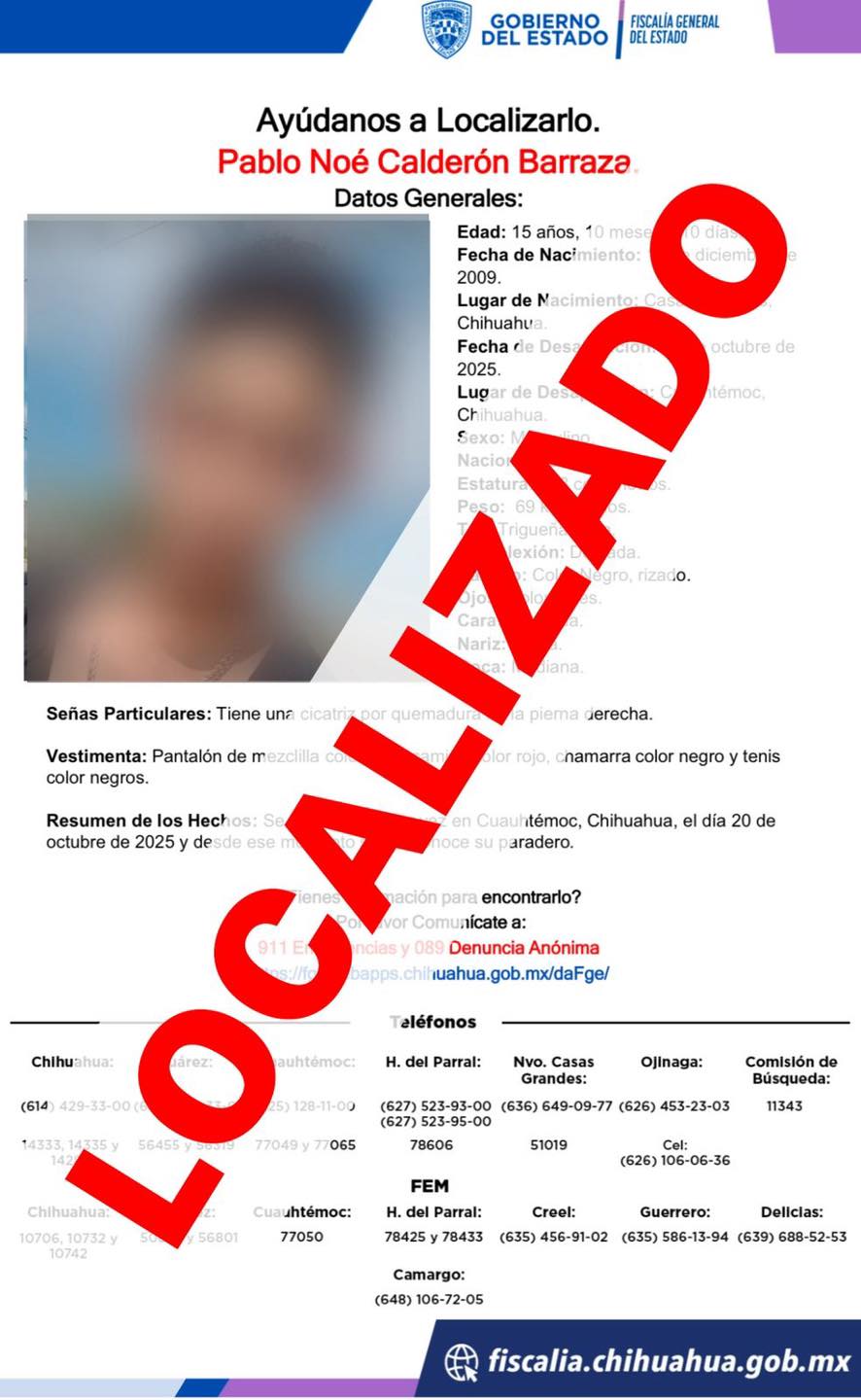 Al ser localizado, el menor, de 16 años de edad identificado con las iniciales P.N.C.B., manifestó ante el Ministerio Público y agentes de la Unidad de Investigación de Personas Desaparecidas y /o Ausentes, que salió de su domicilio en forma voluntaria.