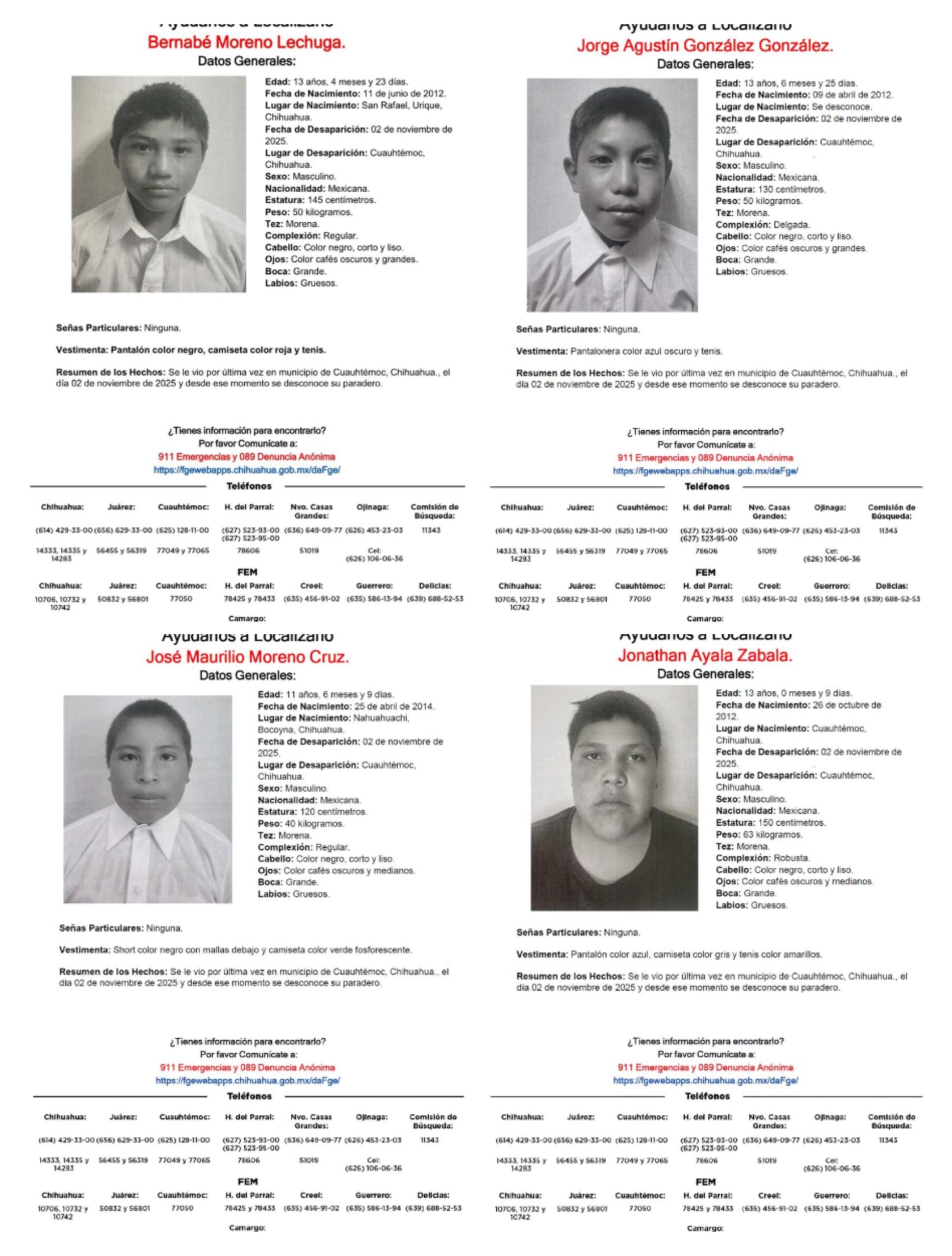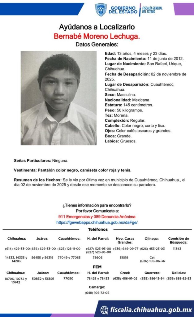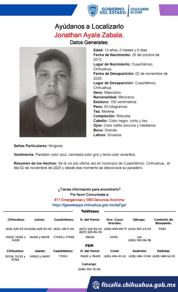 De igual manera, se busca a Jonathan Ayala Zabala, de 13 años, visto por última vez el 2 de noviembre de 2025 en Cuauhtémoc. Nació el 26 de octubre de 2012 en Cuauhtémoc.Vestía pantalón azul, camiseta gris y tenis amarillos al momento de su desaparición.