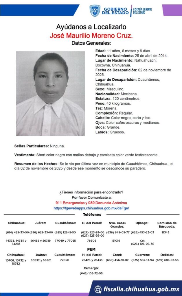 José Maurilio Moreno Cruz, de 11 años, desaparecido también el 2 de noviembre en Cuauhtémoc. Nació el 25 de abril de 2014 en Nahuahuachi, Bocoyna, Chihuahua.
