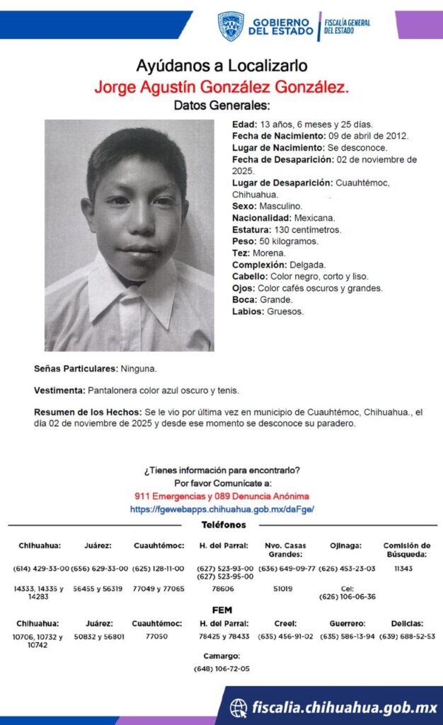 Jorge Agustín González González, 13 años. Fue visto por última vez el 2 de noviembre de 2025 en el municipio de Cuauhtémoc.