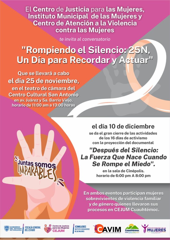 La coordinadora de CEJUM en Cuauhtémoc, hizo una atenta invitación a la ciudadanía, al conversatorio denominado “Rompiendo el Silencio: 25 N, un día para recordar y actuar”, que se efectuará el próximo martes 25 de noviembre, en el que participarán mujeres que han llevado sus procesos en CEJUM.