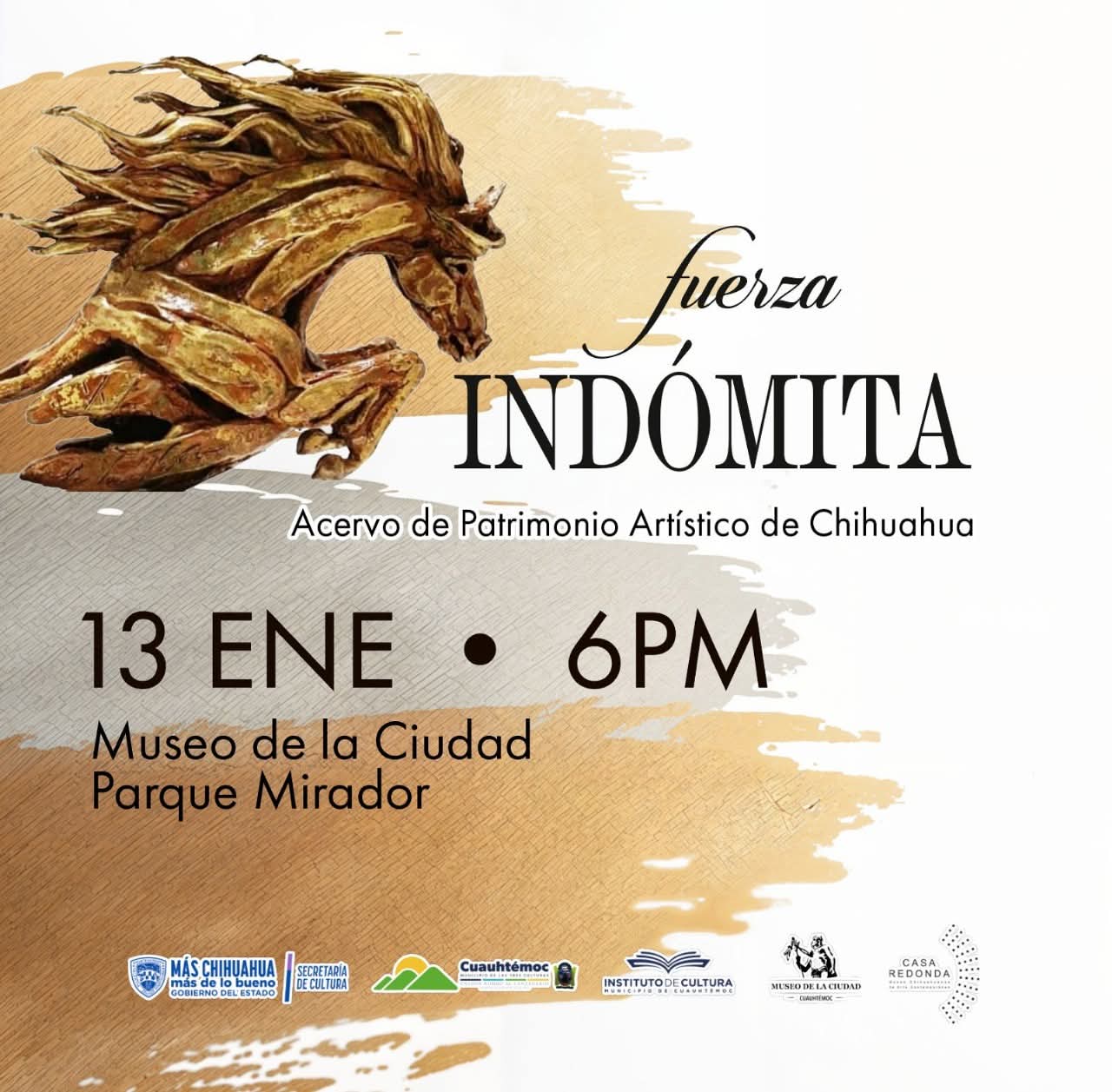 El Museo de la Ciudad, en el Parque Mirador, presentará la exposición “Fuerza Indómita”, integrada por esculturas en bronce de diversos autores como parte del Acervo de Patrimonio Artístico de Chihuahua, el próximo martes 13 de enero a las 6:00 de la tarde.