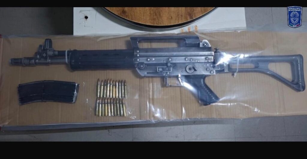El citado masculino portaba un arma larga con la leyenda Beretta, calibre 5.56 X 45 y cuatro cargadores para esa arma, abastecidos con 100 cartuchos útiles.